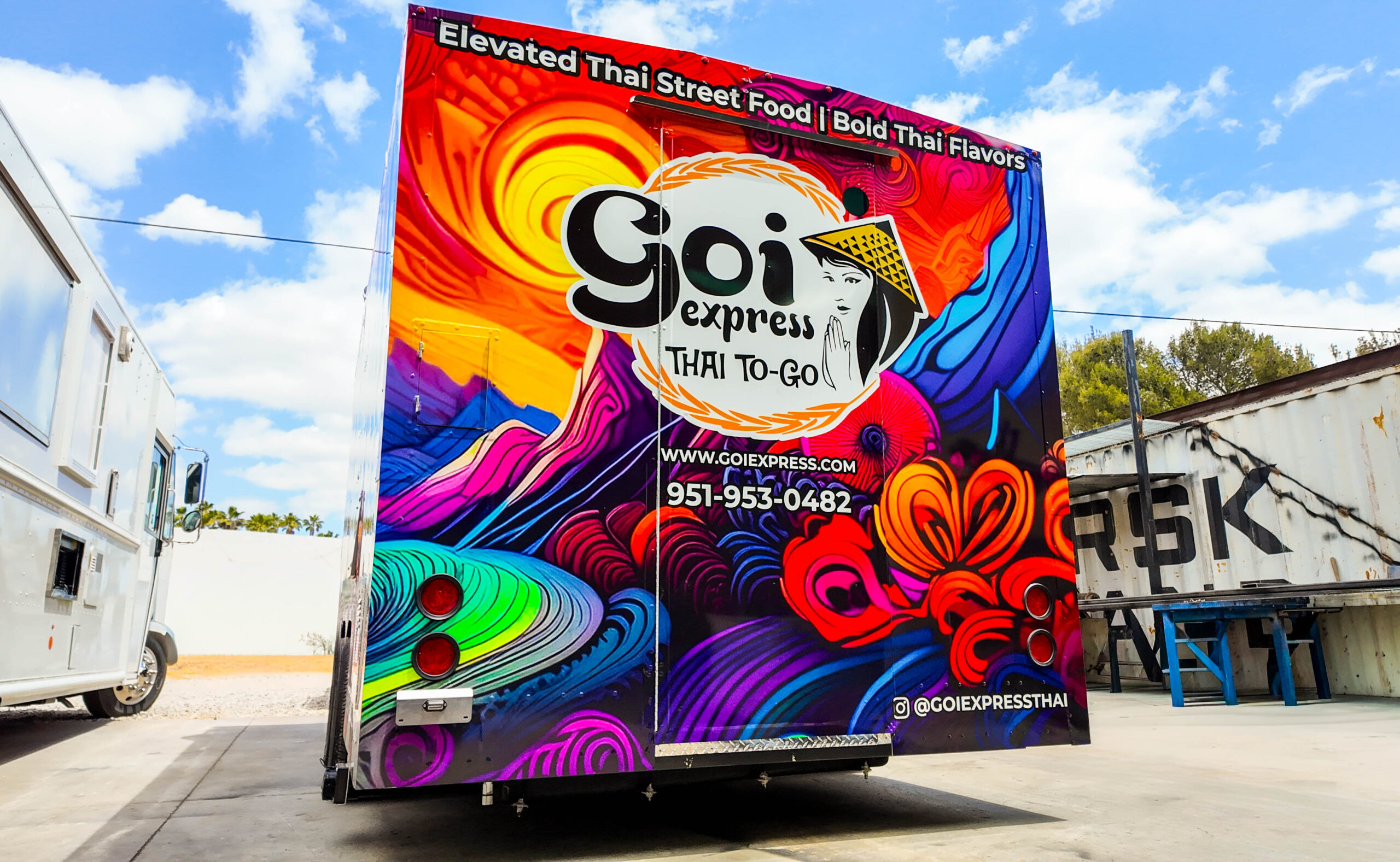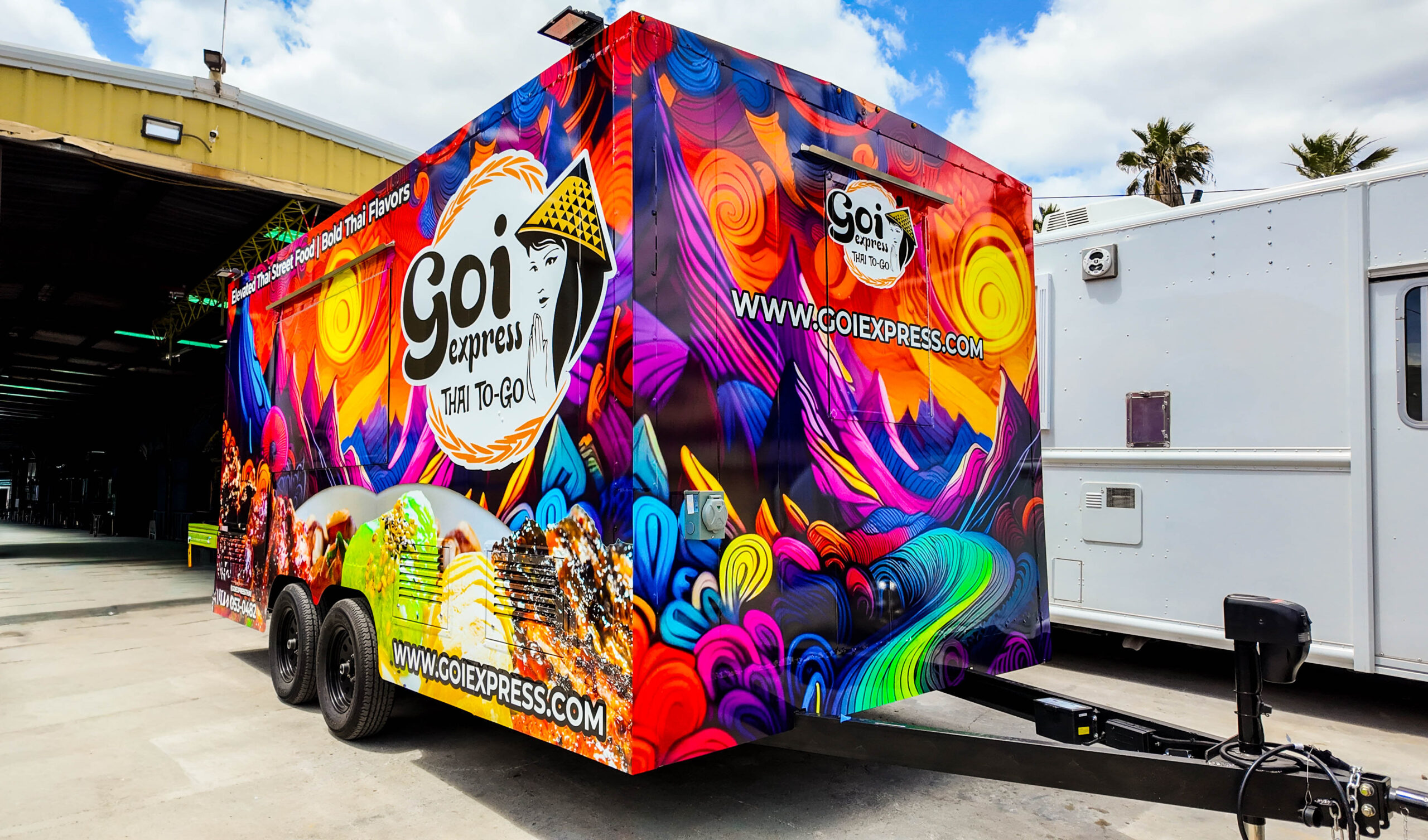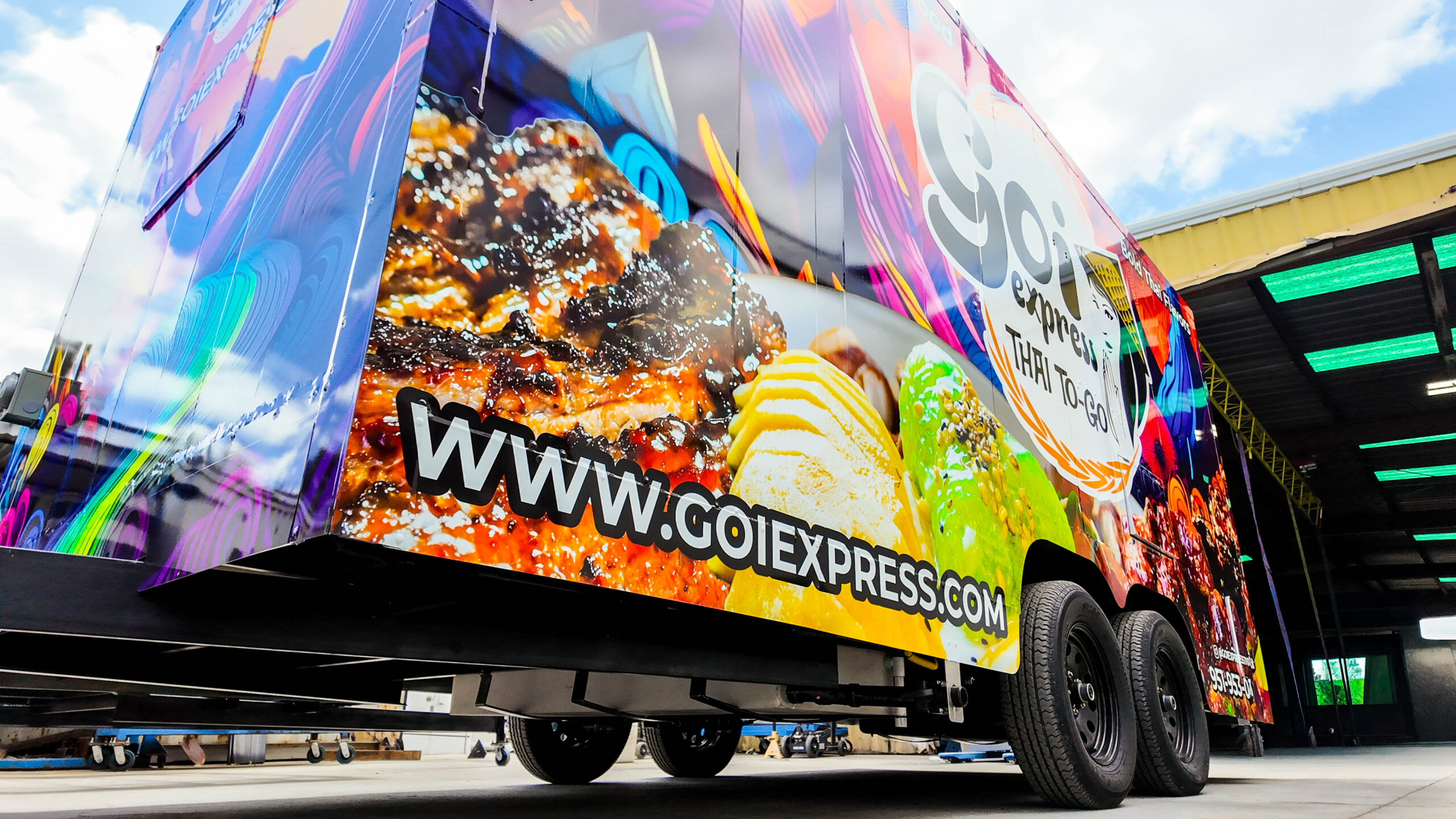 The outside of your food truck, food trailer, experiential vehicle or other mobile business is a rolling billboards for your company. Take advantage of this free marketing space by installing a custom food truck wrap that builds brand awareness and attracts customers. Work with our in-house graphic designer to get a custom wrap design that matches your brand. Our food truck wraps, food trailer wraps and experiential marketing vehicle wraps are made from durable, UV-resistant materials and professionally installed so your food truck will look great for years to come.